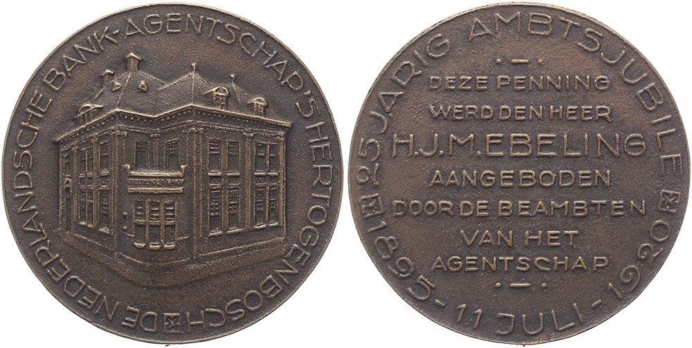 1920 Jubileumpenning uitgereikt aan H.J.M. Ebeling ter ere van zijn 25 jaar Jubileum als Agent van de Nederlandse Bank (Agentschap) te ’s-Hertogenbosch. Kantoor van het Agentschap. / Zevenregelige tekst. Æ 65 gegoten. KB II-63. Prachtig.