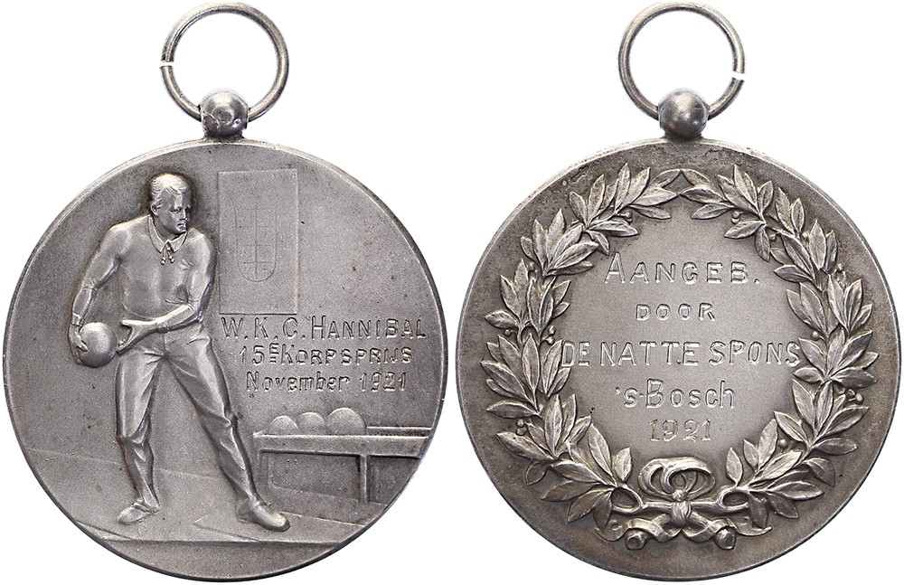 1921 Penning uitgegeven bij het behalen van de 15e Korpsprijs door de Politie Kegelclub W.K.C. Hannibal. Speler met in rechterhand een kegelbal. / Samengebonden eikenlooftakken met daarin vijfregelige tekst. AR 40,5. Met draagoog en ringetje. Prachtig.