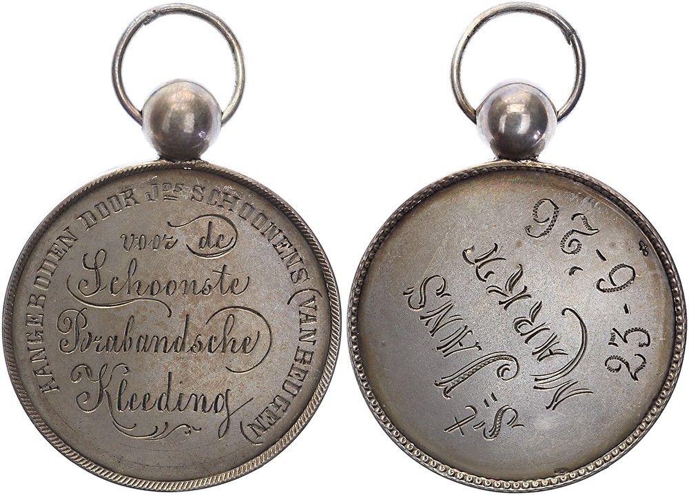 1926 Beloningspenning uitgeloofd ter gelegenheid van de St. Jansmarkt voor de Schoonste Brabantsche Kleding aangeboden door J.J.A.M. Schoones. Omschrift en in het veld vierregelige tekst. / Drieregelige tekst. AR 43. Aan beide zijden opstaand versierd randje. Met bolletje en draagringetje. Zeer fraai.