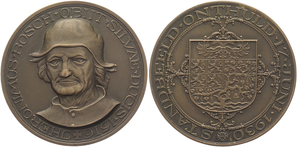 1930 Onthulling standbeeld Jeroen Bosch. Portret van Jeroen en face. / Wapen van ’s-Hertogenbosch. Æ 60. KB III-397. J.J. van Goor. Zeer fraai..