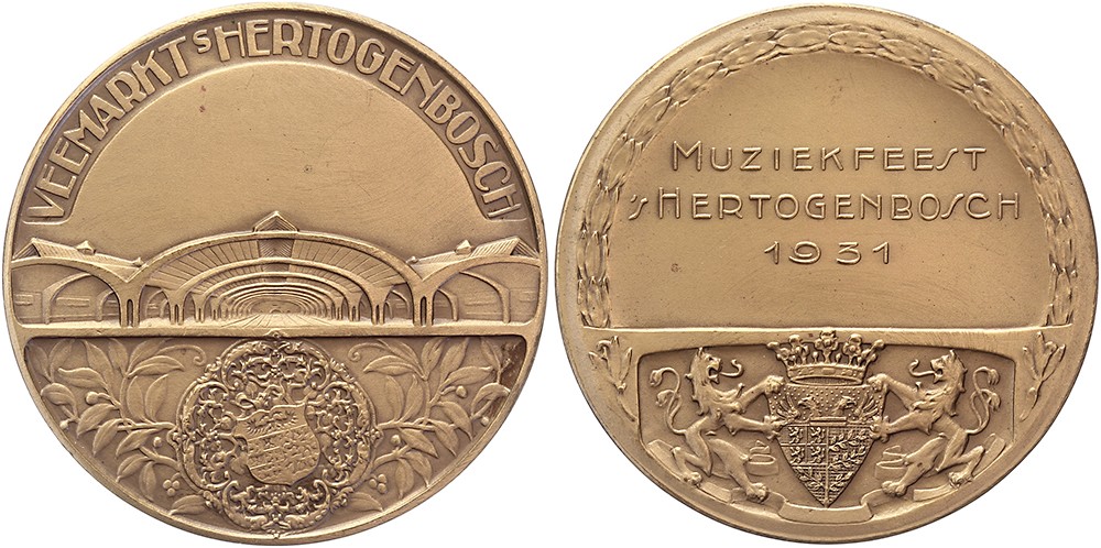 1931 Penning uitgegeven bij de Muziekfeest in 1931 bij de opening van de nieuwe Veemarkt te ’s-Hertogenbosch. Gekroond wapen van ’s-Hertogenbosch. / Veemarkthallen. Æ 51. Prachtig.