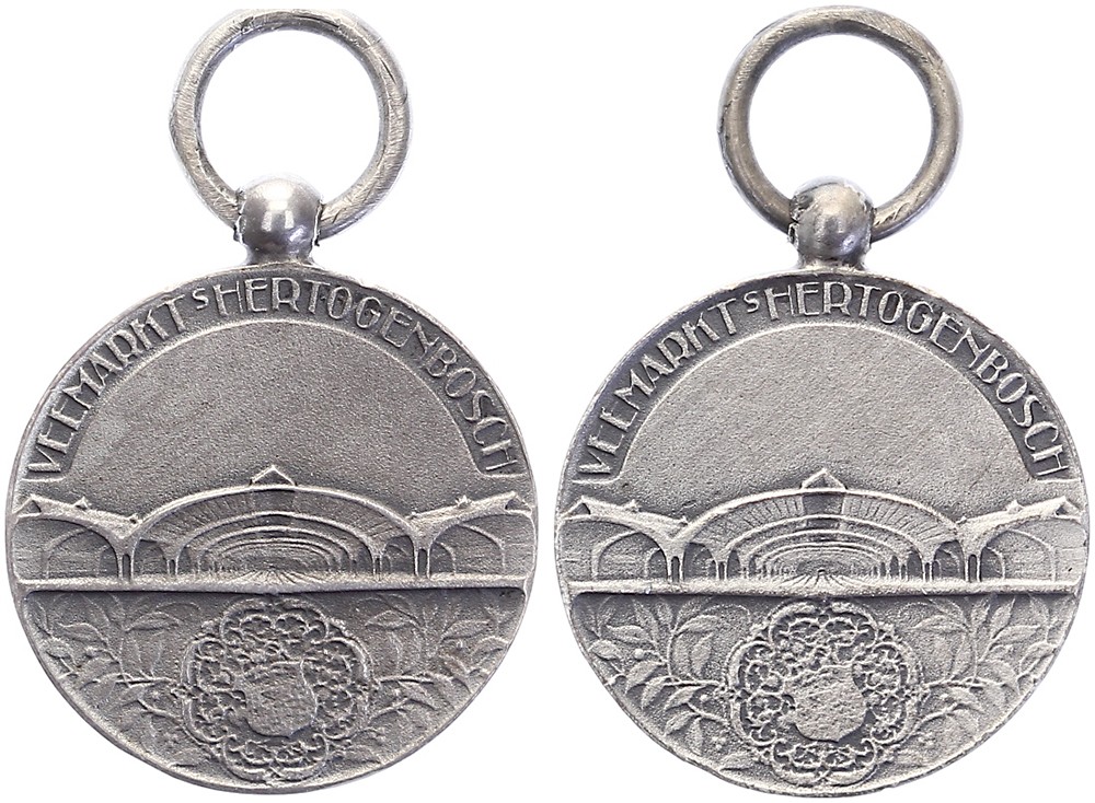 Lot (2) 1931 Draagpenning uitgegeven bij de Feestweek te ’s-Hertogenbosch bij de opening van de Veemarkt. Wapen van ’s-Hertogenbosch met daarboven afbeelding van Veemarkthallen. / Lauwerkrans rondom met daarin vijfregelige tekst. Nikkel (vermoedelijk) 21. Met draagoog en ringetje. Zeer fraai.