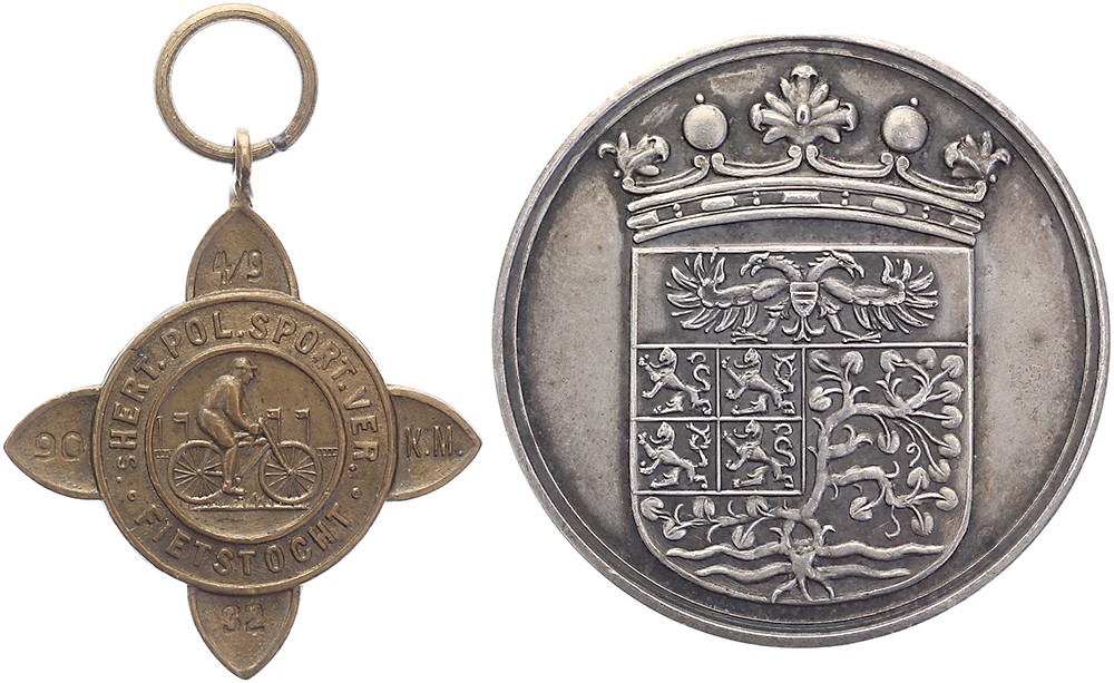Lot (2) 1932 Penning uitgegeven bij een hondententoonstelling georganiseerd door de Kynologen Club ’s-Hertogenbosch en Omstreken. Gekroond stadswapen ’s-Hertogenbosch. / vierregelige tekst. AR 40. Toegevoegd: éénzijdige draagpenning voor 90 km Fietstocht. Koper 31 x 31. Zeer fraai.