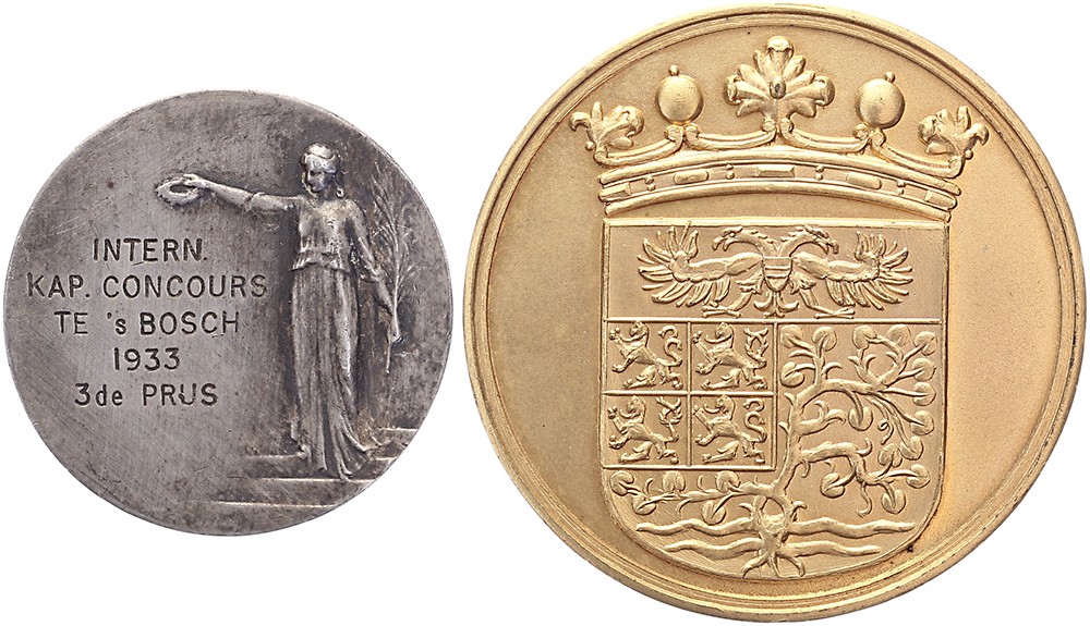 Lot (2) 1933 Penning uitgegeven bij de gelegenheid van het Internationaal Kappers Concours te ’s-Hertogenbosch. Vrouw afdalend van trap. / Open veld (naam winnaar niet ingevuld). AR 29. Toegevoegd: Penning uitgegeven bij een hondententoonstelling. Koper verguld 40. Zeer fraai.