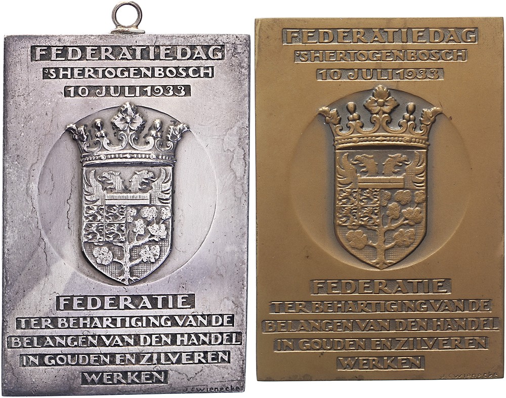 1933 Eenzijdige plaquette van de Federatiedag der Goud- en Zilversmeden gehouden te ’s-Hertogenbosch. Gekroond wapen van ’s-Hertogenbosch met daaronder en daarboven tekst. AR 70 x 48. Met draagoog. J.C. Wienecke. Prachtig.