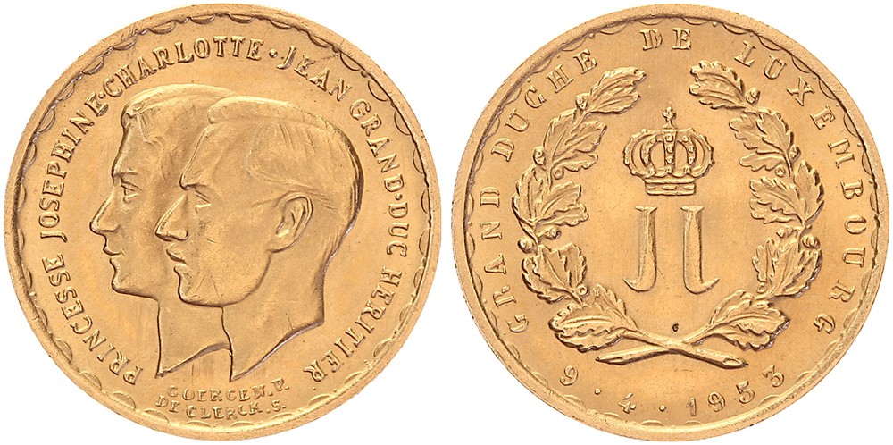 1953 Huwelijk Josephine & Jean. Twee hoofden naar links. / Monogram JJ tusen eikentakken AU 21 [6,45 gram, 900/1000]. Probst 01. E. Goergen & O. de Clerck. Unc.