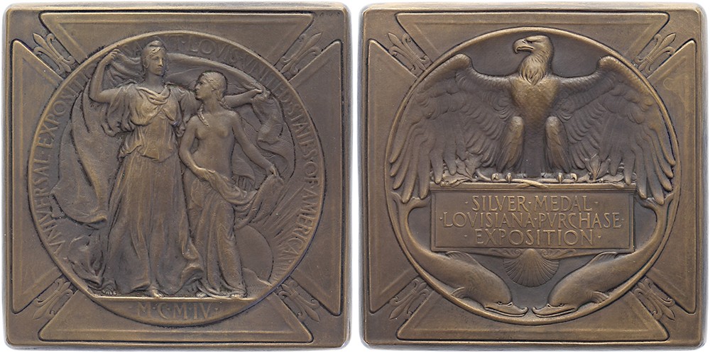 1904 Louisiana Purchase Expo Exhibit Award Silver Medal in Bronze. Draped male and female figures above date in Roman numerals. / Spread-winged eagle atop tablet inscribed: SILVER MEDAL LOVISIANA PVRCHASE EXPOSITION Æ, square, 65 x 65 mm. EF.