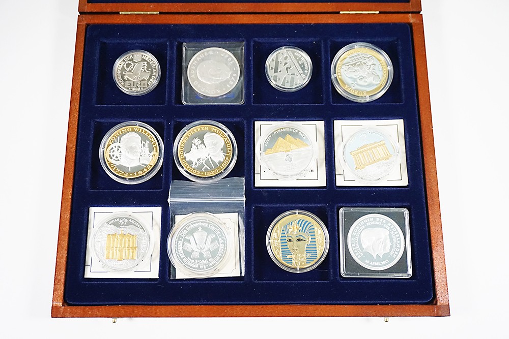 Bruine cassette met 12 penningen, divers vnl. zilver.