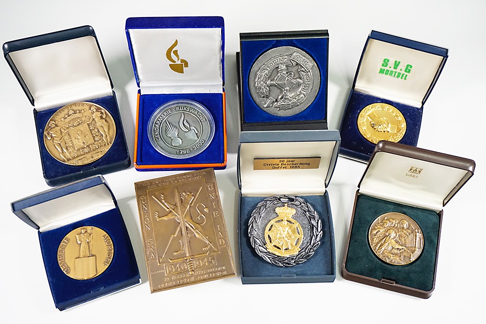 Doosje (8) Belgische penningen, meest AE, klein- en grootformaat. Bijna allen in originele cassette.