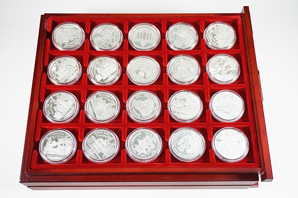 Twee Leuchtturm muntboxen met 26 x zilveren 1-Troy Ounce penningen; thema: Europa. Netto zilver: 808 gram. Tevens enige andere penningen met hetzelfde thema.