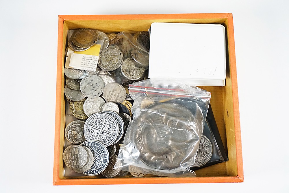 Houten doosje met veel imitaties oude munten. Van zeer knullig tot redelijk.