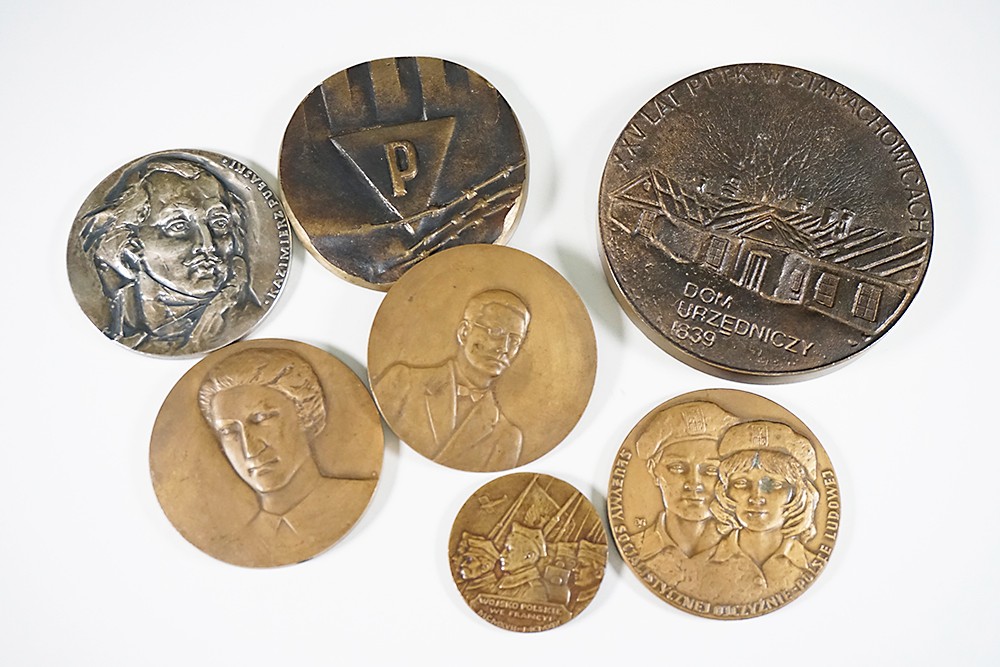 Plastic potje Poolse penningen (7), klein- en grootformaat, w.o. Putasky en Buchenwald. Dik 1,5 kg.!