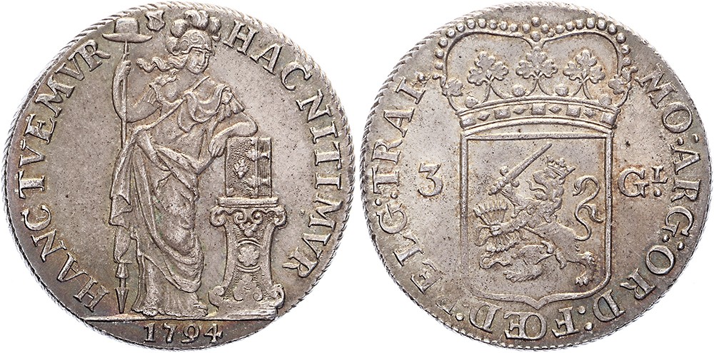 3 Gulden 1794. Delm. 1150; CNM 2.43.117; HPM 71. Licht patina. Prachtig.