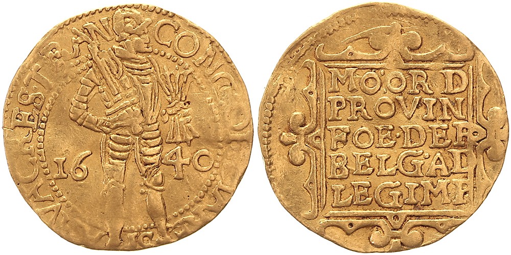 Gouden dukaat 1640, vier pijlen in bundel. Delm. 1054; CNM 2.38.49; HPM 24 [3,42 gram]. Zeer fraai.