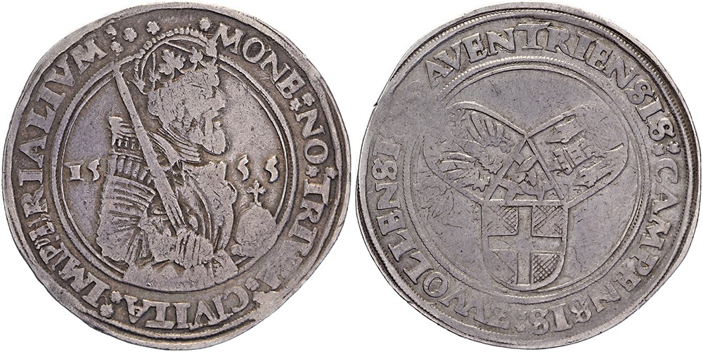 Karolusdaalder 1555. Omschrift vz.: *** MONE: NO: TRIVM: CIVITA: IMPERIALIVM:Delm. 673; FD 38a variant. Fraai / zeer fraai.