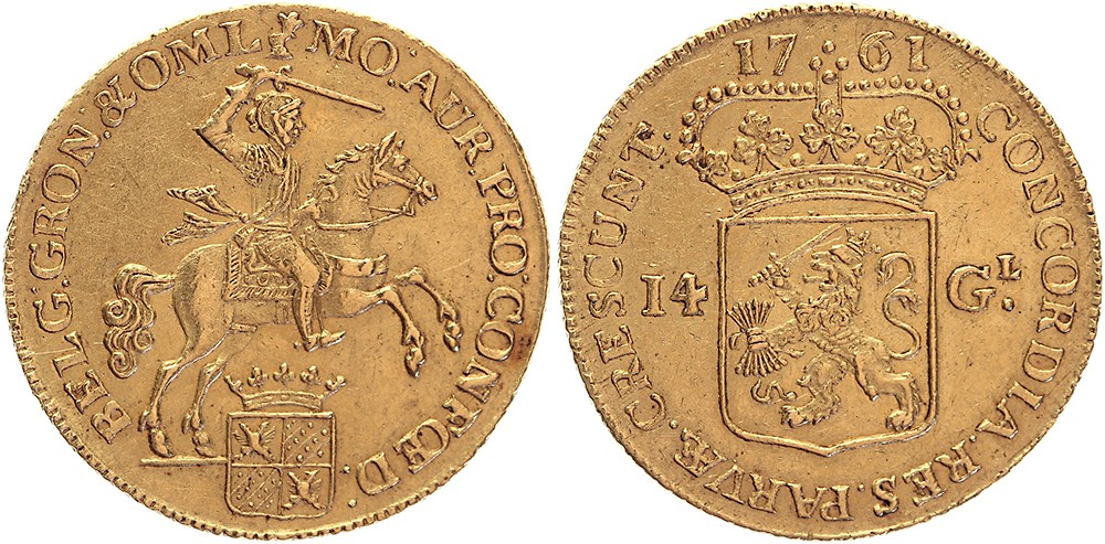 Gouden rijder of 14 gulden 1761. Delm. 1161; CNM 2.20.6; HPM 01 [9,94 gram]. Prachtig.