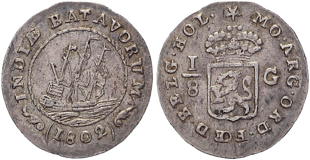 1/8 Scheepjesgulden 1802. Scholten 496b. Prachtig.