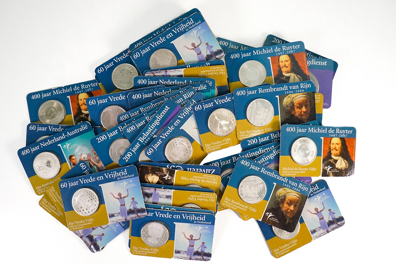 Restant (159) handelsvoorraad coincards: 70 x € 5 zilver; 19 x € 10 zilver; 67 x € 5 verzilverd en 3 x € 10 verzilverd. In vier groene muntdozen. Nominaal: € 905.