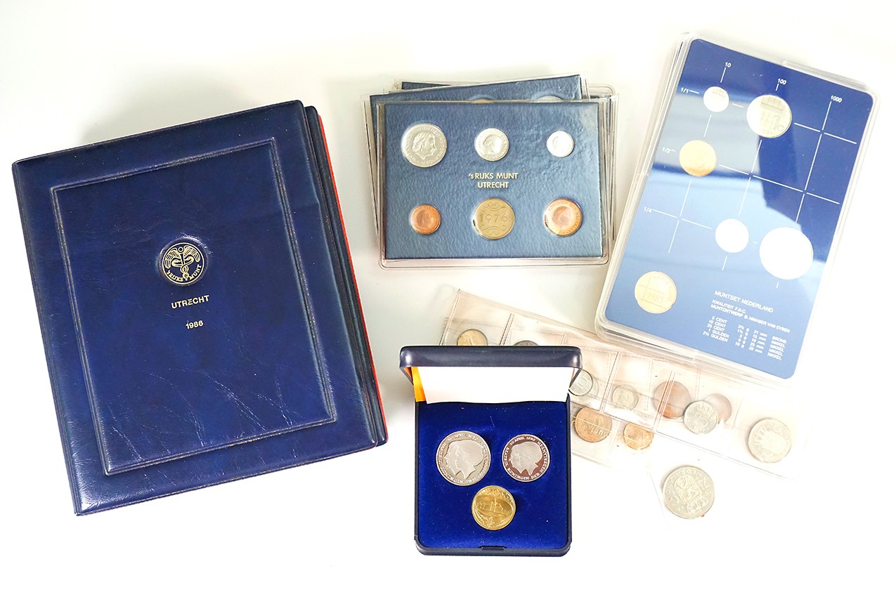 Doos met ondermeer een kistje met daarin strips van ’s Rijksmunt 1972-1975. Alsmede FDC-sets 1976-1986, proofsets 1982-1985 en 1986.