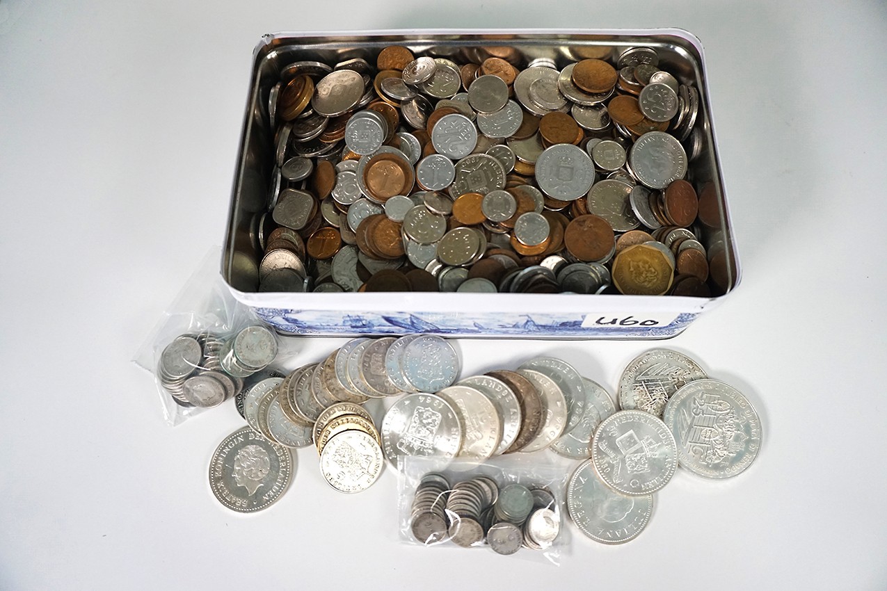 Groot blik pasgeld Nederlandse Antillen + enig zilver (ca. 500 gram netto).
