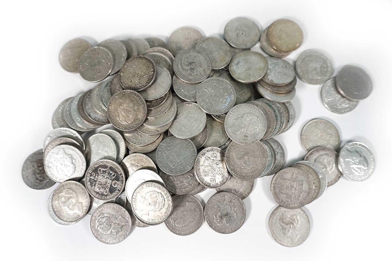 Blik (108) Wilhelmina rijksdaalders 1929-1943, w.o. 3 x 1940. Netto zilver: 1938 gram.