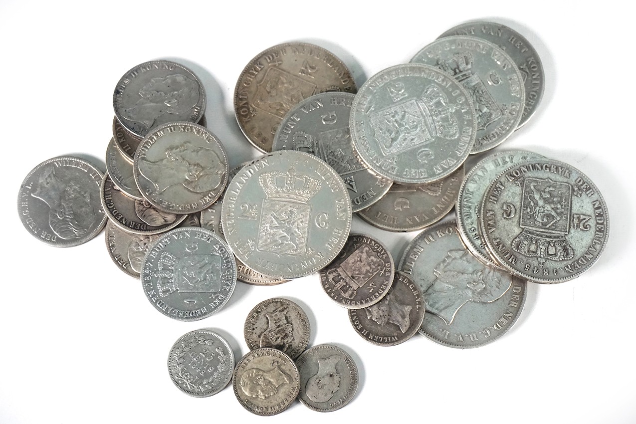 Blikje diverse munten koning Willem II (25); kwartjes, halve- en hele guldens, rijksdaalders.