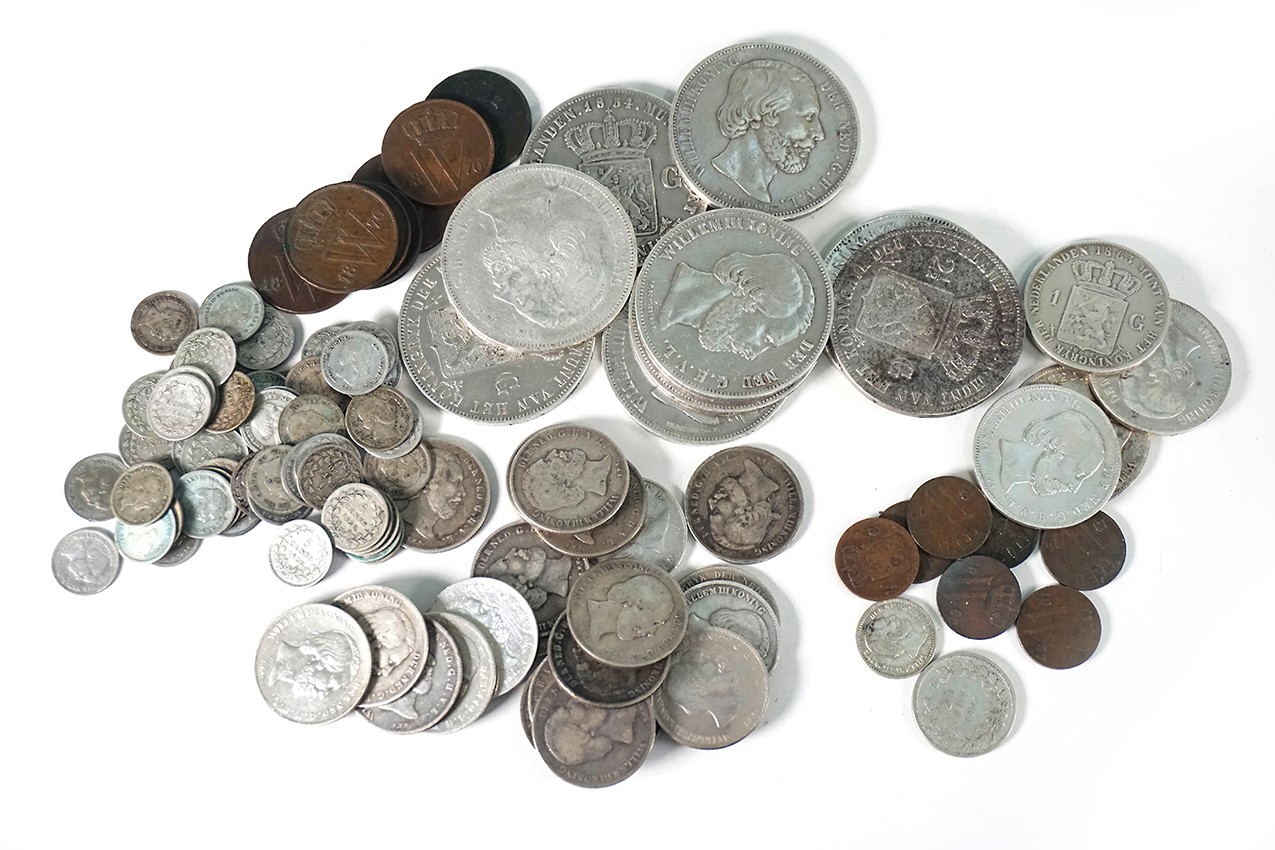 Blikje munten koning Willem III; ½ centen, centen, stuivers, 10 cent, 25 cent, ½ guldens, guldens en rijksdaalders (108). Diverse kwaliteiten.