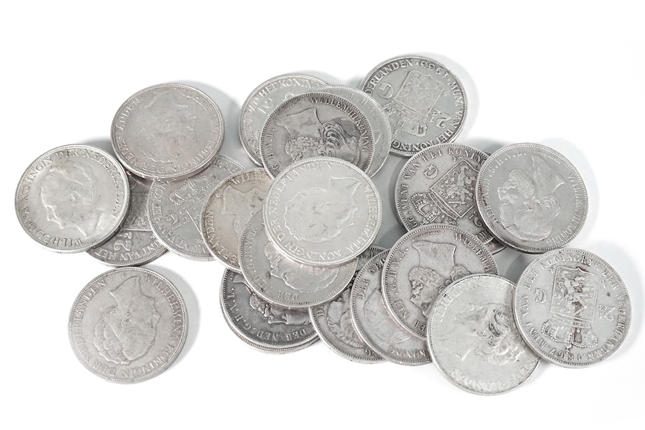 Blikje met 22 zilveren munten. 11 Rijksdaalders van Willem III en 11 rijksdaalders van Wilhelmina