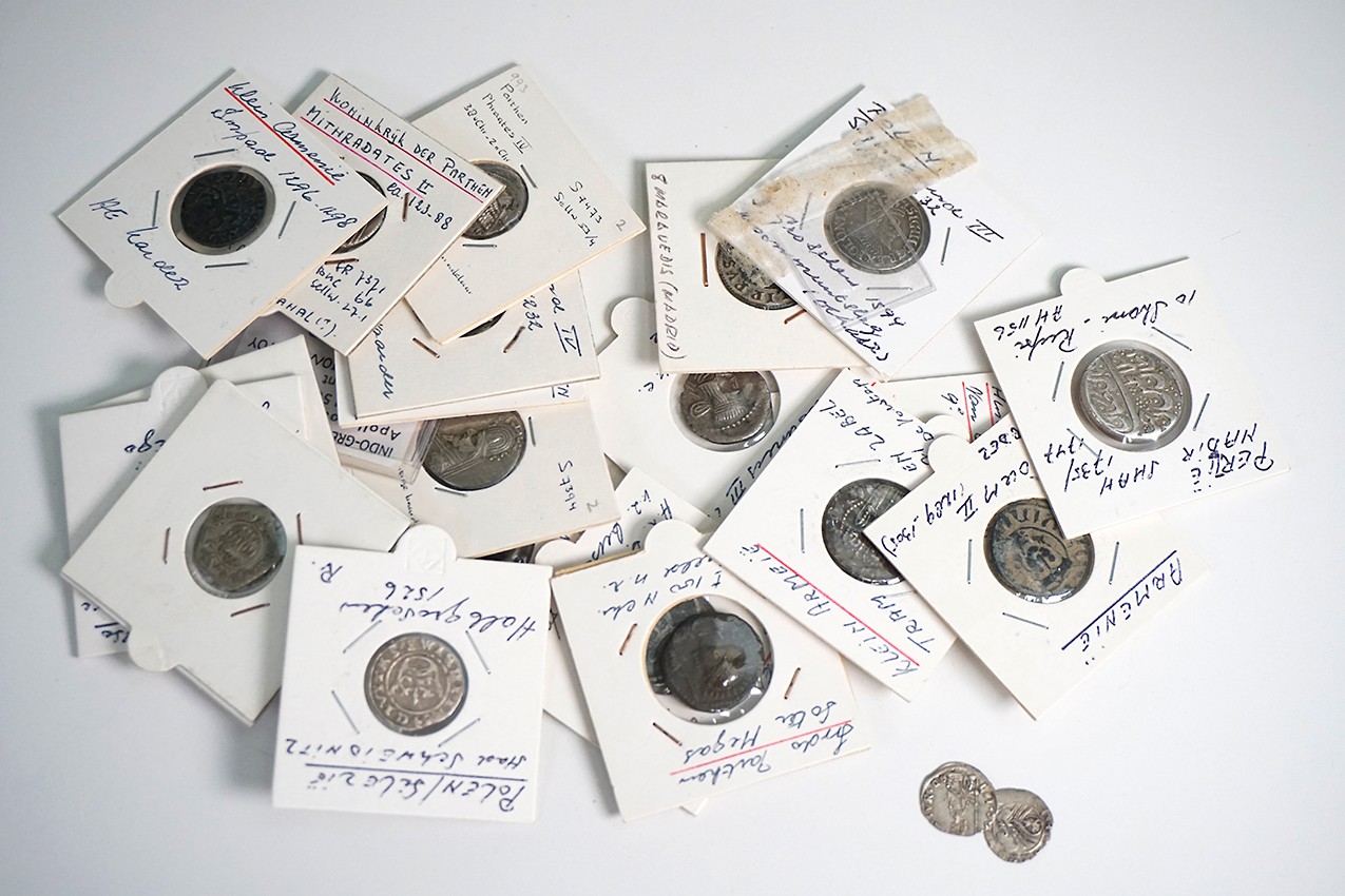 Blikje met onuitgezocht lot Parthen. Goed beschreven! Toegevoegd: klein aantal middeleeuws. Totaal aantal munten: 23.