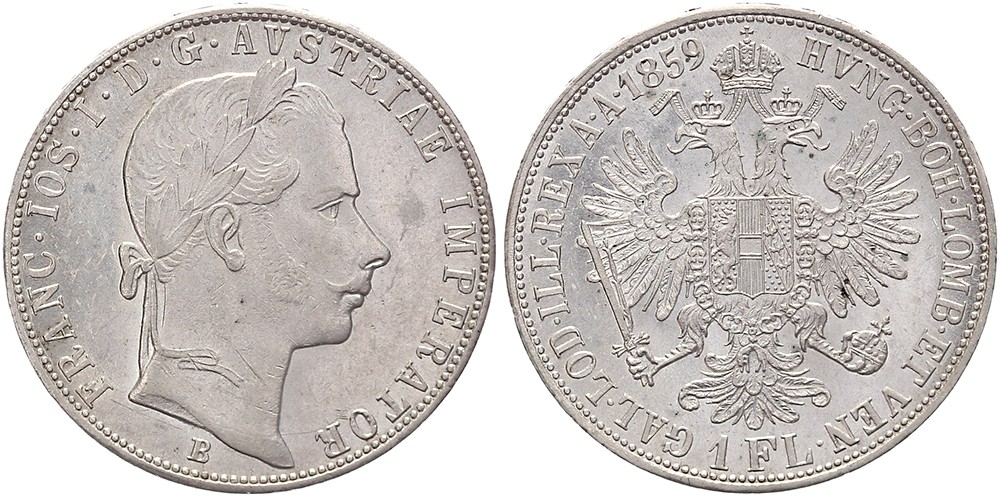 Florin 1859B. KM 2219. Fast Stempelglanz.