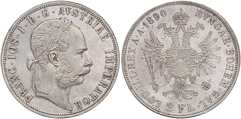 Doppelgulden 1890. Dav. 27; KM 2233. Fast Stempelglanz.