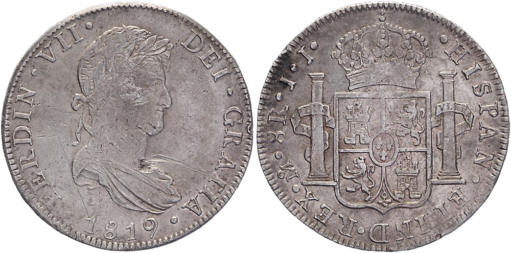 8 Reales 1819JJ. KM 111. Damaged obverse. Fine.