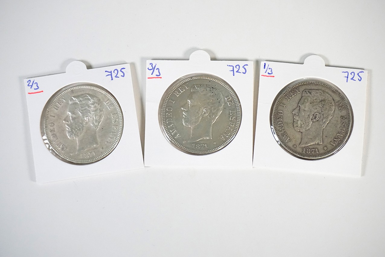 Lot (3) 5 Pesetas 1871 (71 & 74 & 75). KM 666. Abt. VF.