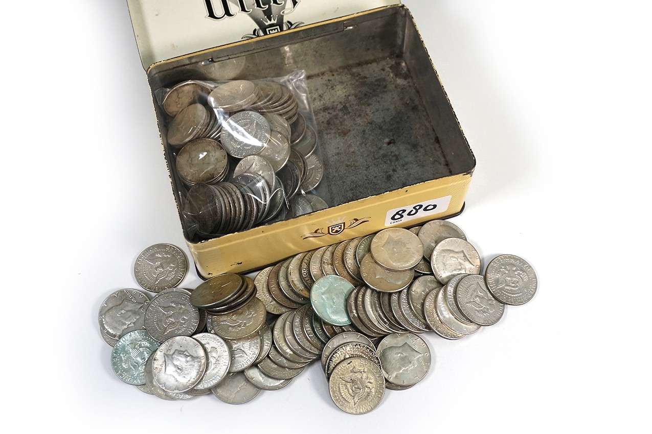 U.S.A. Blikje ½ Dollars Kennedy 1964 (64x) en 1965-1970 (74x). Netto zilver: 1056 gram.