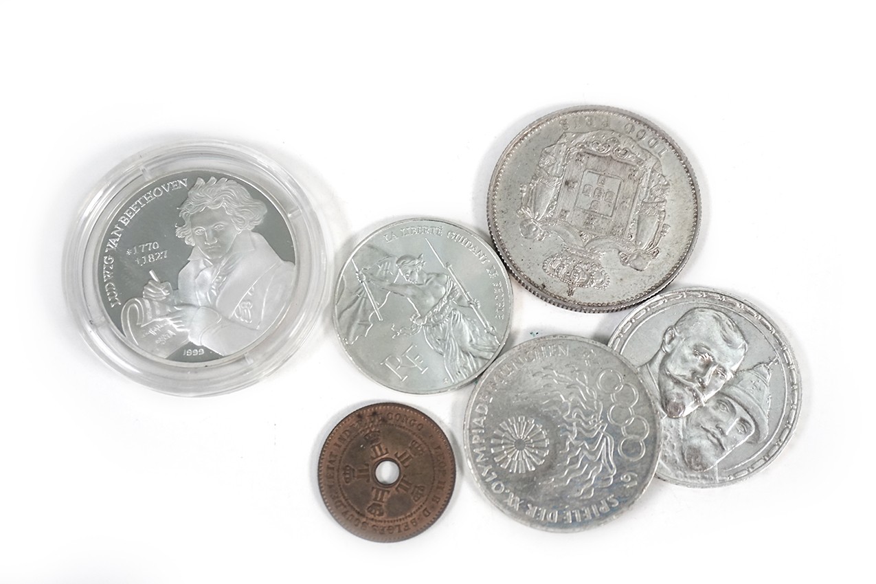 Doosje met diverse zilveren munten, o.a. 250 Won Korea 1999, 1000 Reis Portugal 1899, 100 Francs Frankrijk 1993 etc.