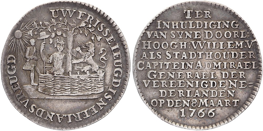 1766 Willem V ingehuldigd als erf-stadhouder. Willem treedt binnen Hollandse tuin met Nederlandse maagd, leeuw en oranjeboom. / Elfregelig opschrift. AR 27,4. VvL 388. Zeer fraai.