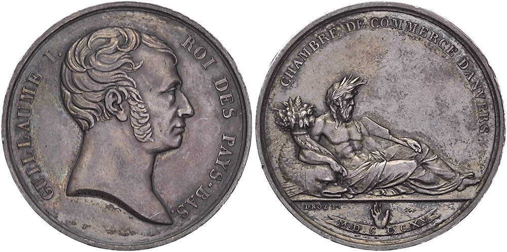 1815 Kamer van Koophandel te Antwerpen. Buste Willem I naar rechts. / Riviergod Schelde met hoorn des overvloeds en scheepsroer rustend op een dolfijn.AR 32. Dirks 66a. J. van de Goor & Droz. Donker patina. Prachtig.N.B. Ex veiling 11 Laurens Schulman, november 1993, kavel 1014