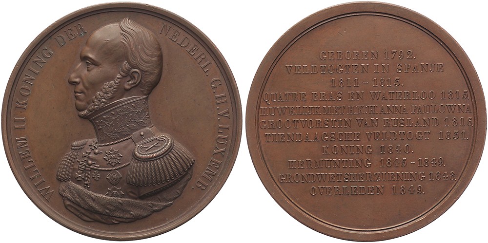 1849 Overlijden koning Willem II. Borstbeeld in militair uniform naar links. / Elfregelig opschrift met vermelding belangrijkste gebeurtenissen gedurende zijn leven.Æ 65. Dirks 681; Bax 85. J.P. Schouberg. Prachtig.