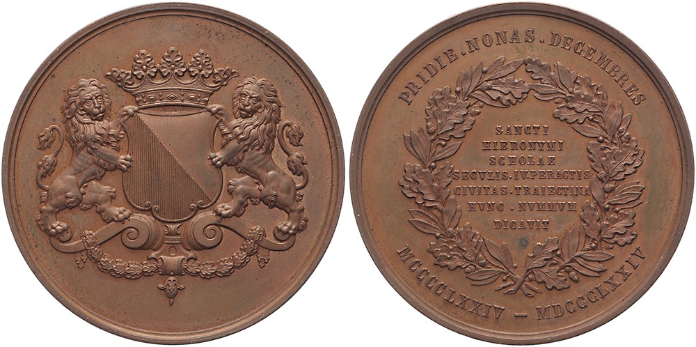 1874 Utrecht, 400 jaar stedelijk gymnasium. Gekroond stadswapen gehouden door twee leeuwen. / Op- en omschrift in en om eikenkrans. Æ 58. Zw. 349. (D. van der Kellen & J.P.M. Menger). Miniem spotje keerzijde. Prachtig.