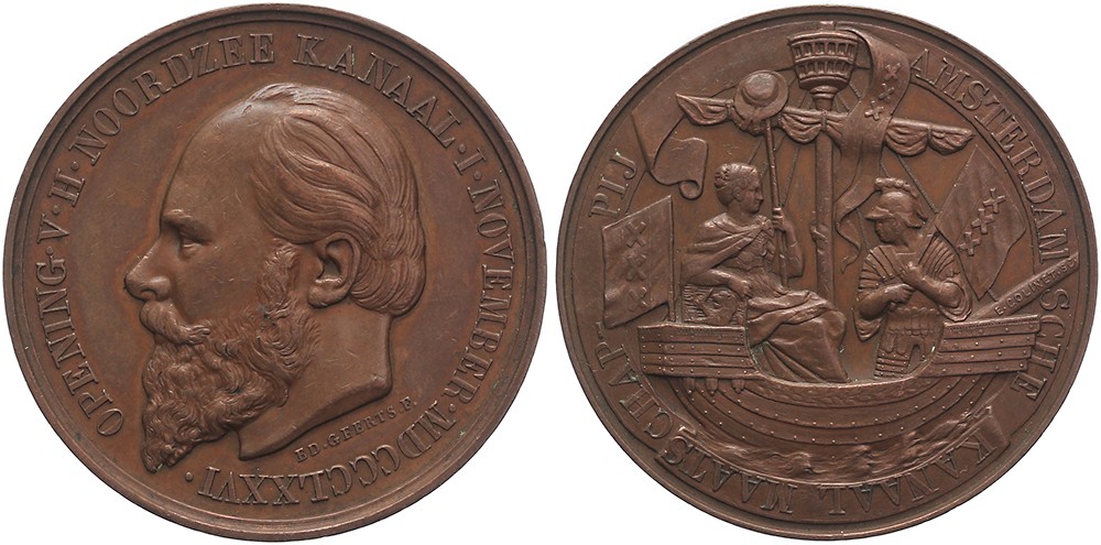 1876 Opening Noordzeekanaal. Hoofd koning Willem III naar links. / Galei met soldaat en Nederlandse maagd. Æ 50. Zwierzina 395. E. Geerts & E. Colinet. Prachtig.