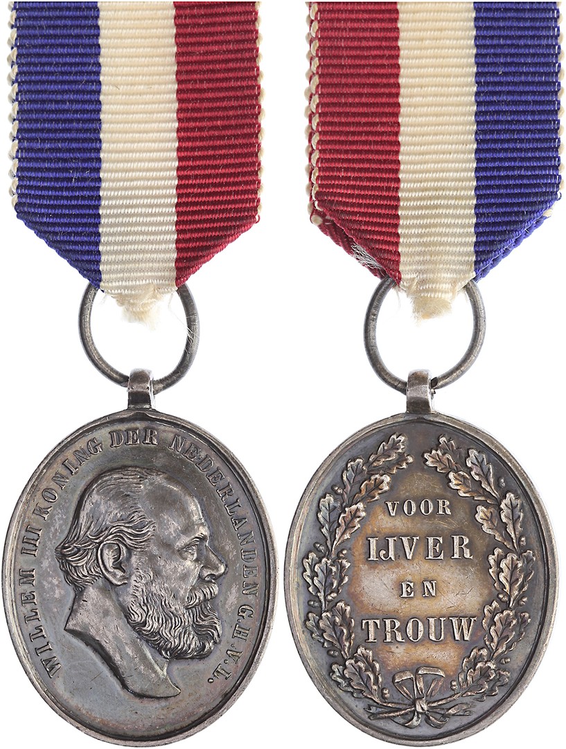 1877 Medaille voor ijver en trouw. Hoofd Willem III naar rechts. / Vierregelig opschrift binnen gestrikte eikentakken. AR ovaal 32 x 25,5 met draagoog en lint.Zwierzina 407; Bax 88; MMW 88. (J.P.M. Menger). Prachtig.