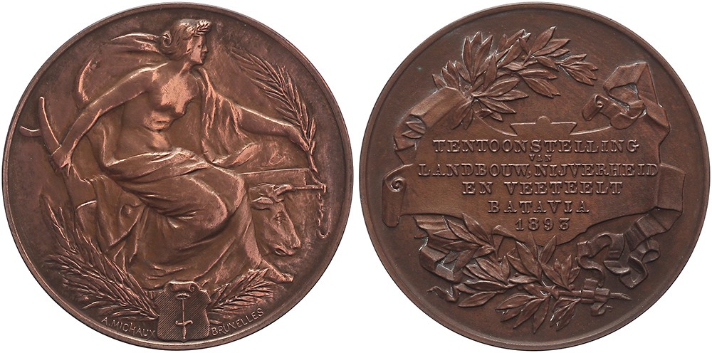 1893 Batavia. Tentoonstelling van landbouw, nijverheid en veeteelt. Zittende halfnaakte vrouw op ploeg met palmtak en koe. / Vijfregelig opschrift op cartouche tussen lauwertakken.Æ 50,7. Zwierzina 1061. A. Michaux. Voorzijde opgewreven. Prachtig.