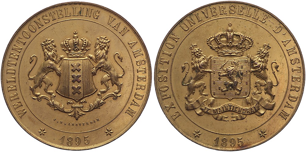 1895 Amsterdam. Wereldtentoonstelling. Gekroond stadswapen gehouden door twee leeuwen. / Gekroond rijkswapen gehouden door twee leeuwen. Æ verguld 55,5. Zwierzina —. ‘J.M.’ Prachtig.N.B. De wereldtentoonstelling voor het Hotel- en Reiswezen vond plaats op het Museumplein en werd overigens niet officieel als wereldtentoonstelling erkent.