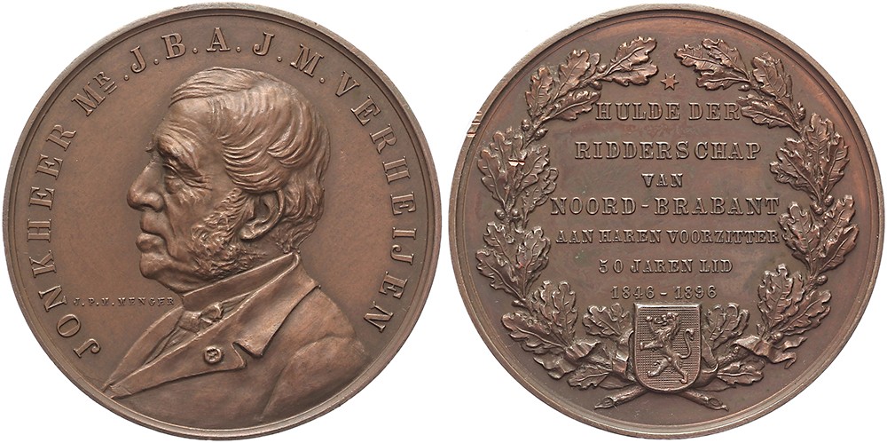 1896 Jhr. Mr. J.B.A.J.M. Verheijen 50 jaar lid Ridderschap Noord-Brabant. Borstbeeld naar links. / Zevenregelig opschrift boven ongekroond Noordbrabants wapen tussen eikentakken.Æ 51. Zwierzina 1241. J.P.M. Menger. Enkele vlekjes veld kz. Prachtig.