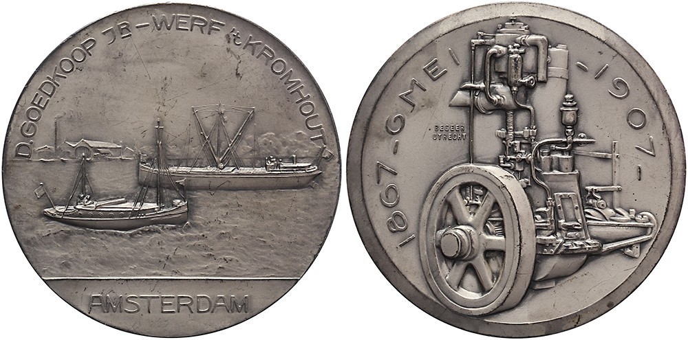 1907 Amsterdam, 40 jaar scheepswerf ’t Kromhout. Twee boten in de Oostenburgergracht. Op de achtergrond de werf aan de Hoogte Kadijk. / Scheepsmotor.Æ verzilverd 59. Zwierzina 742; KB I-729. (J.J. van Goor). Iets vlekkerig. Prachtig.