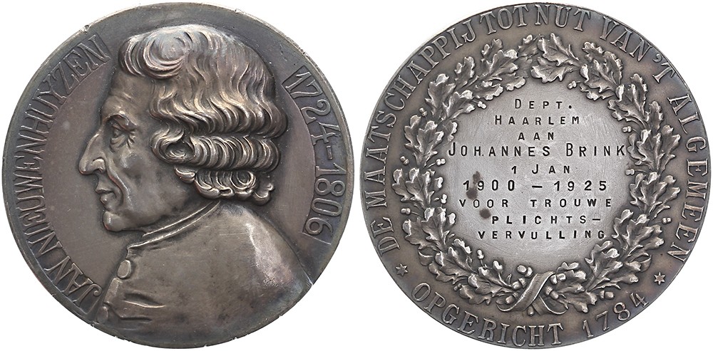 (begin 20e eeuw) Erepenning Mij. tot Nut van ’t Algemeen. Borstbeeld Jan Nieuwenhuyzen, oprichter, naar links. / Inscriptieruimte binnen krans. Op naam van: JOHANNES BRINK, DEPT. HAARLEM, 1900 – 1925 etc.” AR 50,3. Onregelmatige rand. Prachtig.