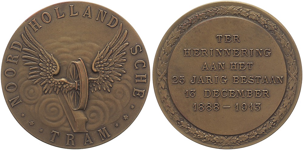 1913 25-Jarig bestaan Noordhollandsche Tram. Gevleugeld wiel op rails. / Opschrift in krans.Æ 46,8. KB I-1065. (J.A. Dal). Prachtig.