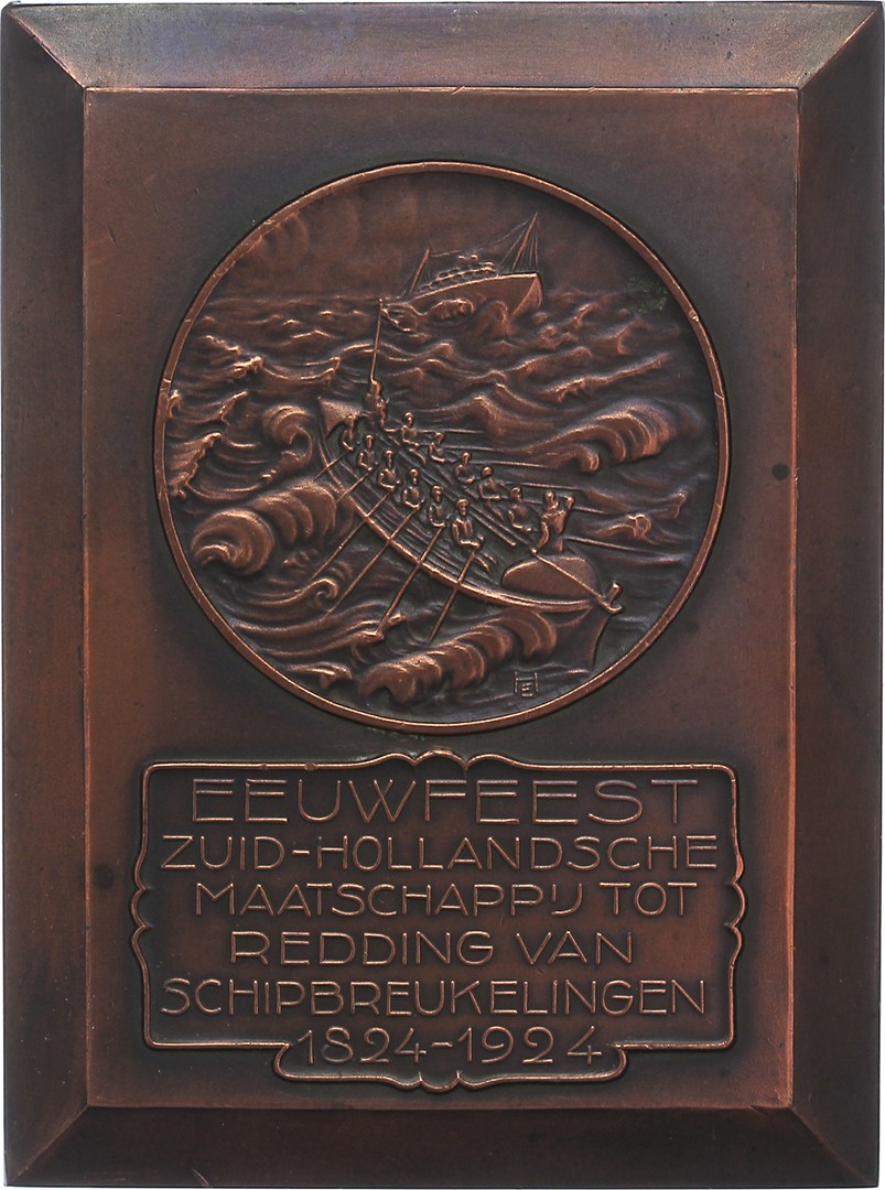 1924 Eeuwfeest Zuid-Hollandsche Mij. tot Redding van Schipbreukelingen. In cirkel reddingsloep op woelige zee, op weg naar schip in nood. Cartouche met tekst daaronder. / Glad.Æ 79 x 58. KB II-433. Ed. Hüttl. Prachtig.