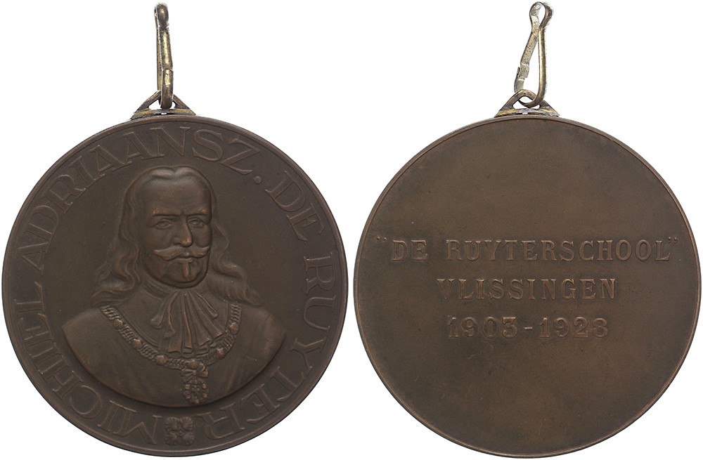 1928 Vlissingen, 25 jaar De Ruyterschool. Borstbeeld Michel Adr. de Ruyter bijna en face. / Drieregelig opschrift. Æ 59 met niet-origineel draagoog. KB III-228. (J.J. van Goor). Prachtig.