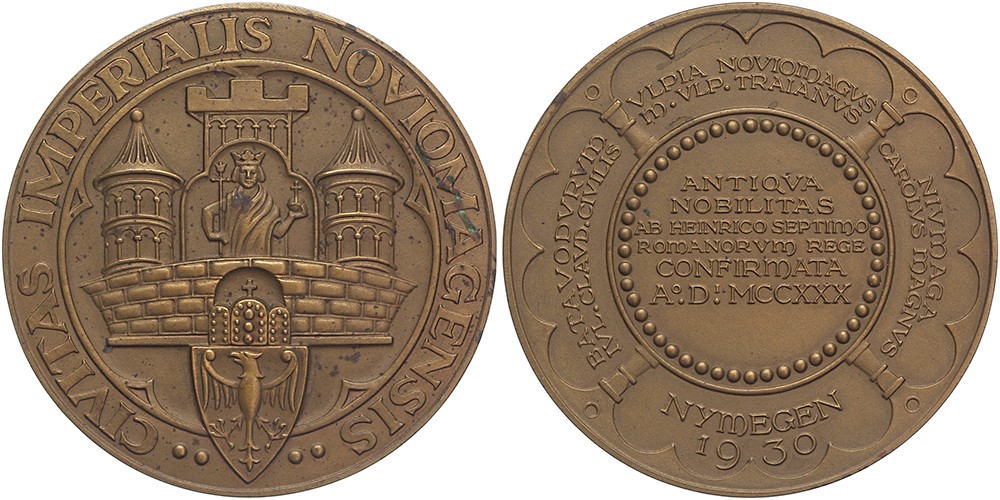 1930 Nijmegen 700 jaar keizerlijke stad. Hendrik VII op kasteelmuur. / Op- en omschrift.Æ 60. KB III-435. (M.P.J. Fleur). In orig. doosje Begeer. Spotjes. Prachtig.